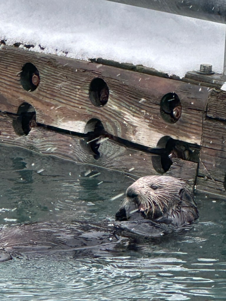 Ocean boats fascinate me. I love walking among them and reading their names, and trying to figure out what the boat does. A lot of boats on the Spit are fishing boats. A fisherman named Dave gave me a herring to lure in a seal. The seal took the bait , but surfaced further away. But I wasn’t disappointed because there was a mama sea otter fussing over a baby perched on her tummy. I have only seen sea otters in zoos. The ones I have seen entertain the crowds as they speed around their enclosures. Now I wonder if that frantic, circular swimming is a form of pacing . The sea otters I saw today were calm and slow, just floating around, checking out the slips for fish scraps and friendly fisherman handouts.