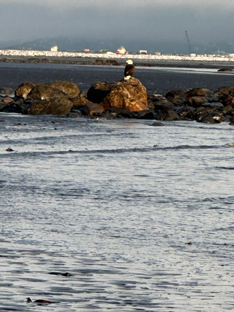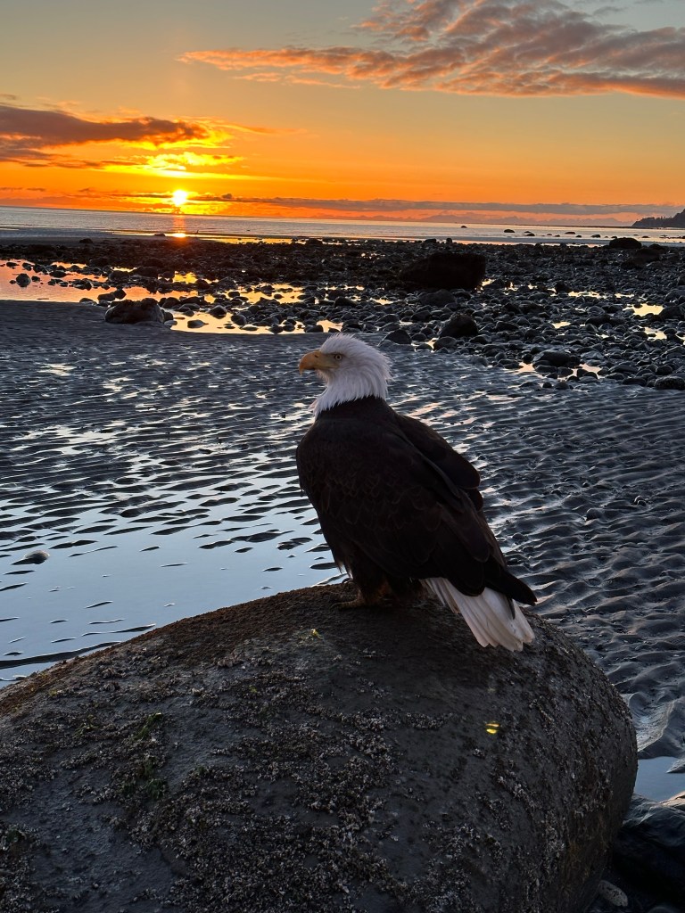 The bald eagle was sitting on the rock when we came to the beach. I thought it would fly off as we approached, but it didn’t seem bothered by us. Two other women approached it and took selfies and photographed the hell out of it. And then traded places with us. I was cautious because the talons were very real. I was so close that I could see the dark wet particles of sad clinging to the yellow gold claws. I was standing right next to a bald eagle. Uncaged. Untethered. Wild. Free. Massive. Magical. I photographed her (?) at every angle in the changing light.