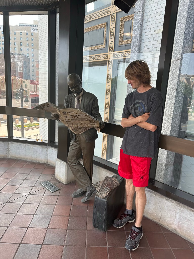 After spending a long time getting off and on the people mover, we decided to go to the Henry Ford museum. While waiting at the bus stop, an older man came over with a shopping cart and a random metal pole, like maybe part of a tent. He commented on Shayne’s green t-shirt, which was covered in paint. He has other clothes, but he almost always looks like he purposely took his clothes from the garbage pile. Shayne asked the man a question about brown pants which made no sense. But the man answered and they had a little chuckle.