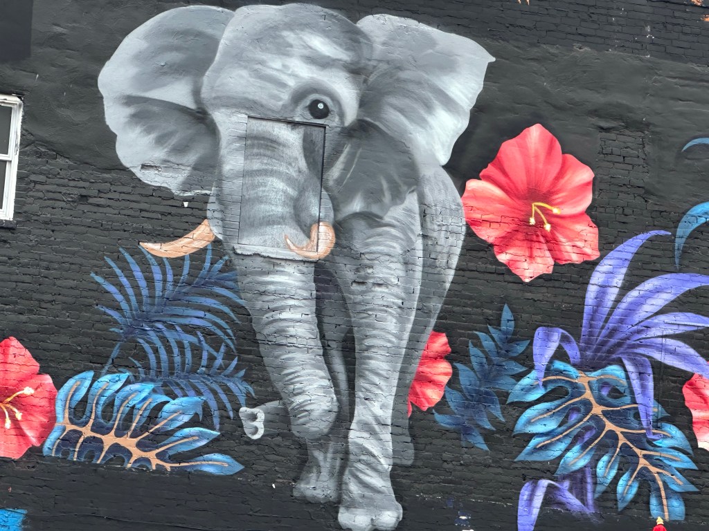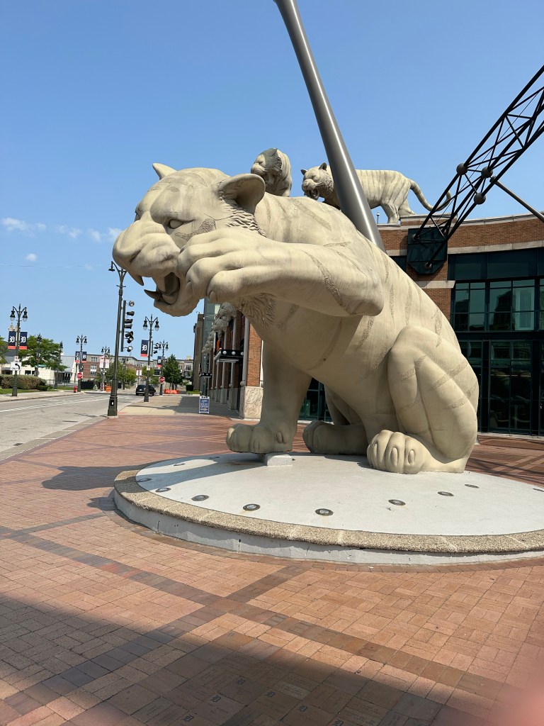 We discovered this thing called “the people mover” which is a train that loops the downtown, but high in the sky. The stations are full of art and there are great views of the street murals. I was super excited, snapping photos, and then I saw the baseball stadium and I wanted to get off and go see it. There was a woman laying on the sidewalk, completely passed out. Shayne said, “This is so sad. We can’t just leave her here.” He actually watched her for a full minute to see that she was breathing and then took his sweatshirt off, and put it on top of her. I snapped photos of the giant tigers in front of the stadium, but couldn’t get the woman on the street off my mind.