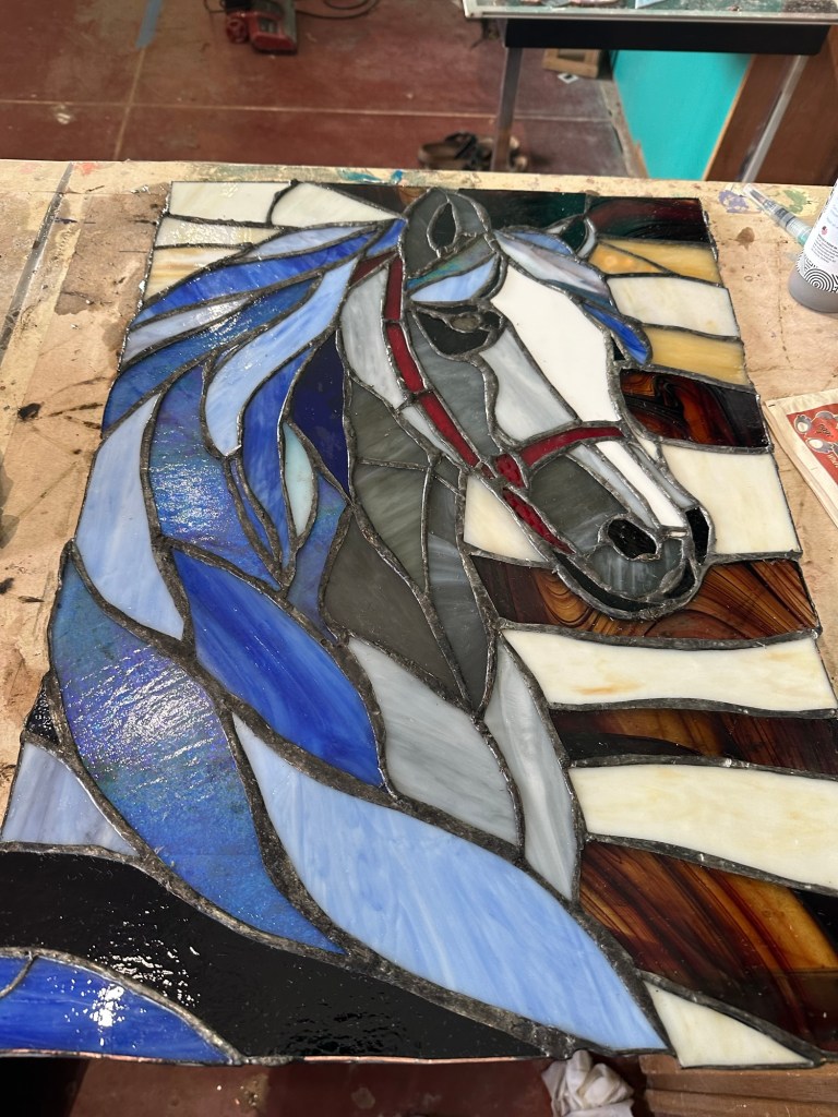 I started a stained glass project. I have fused glass, worked with a torch, and done mosaics, but stained glass is a new art for me. Still, I have complete confidence in my ability to do anything artistic. So I planned an eighteen by twenty four design of a horse, chose my colors, and started cutting glass.